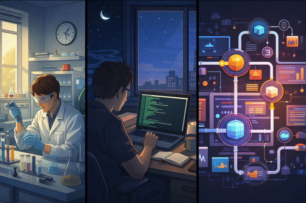 I’m a night owl. I work best at my own pace, late at night, when the world is quiet and I can think deeply about a problem. The wet lab simply doesn’t care about that. Experiments run on their own schedule. Cells don’t wait for you to be a morning person. Protocols demand precision at 8 AM whether you slept well or not.